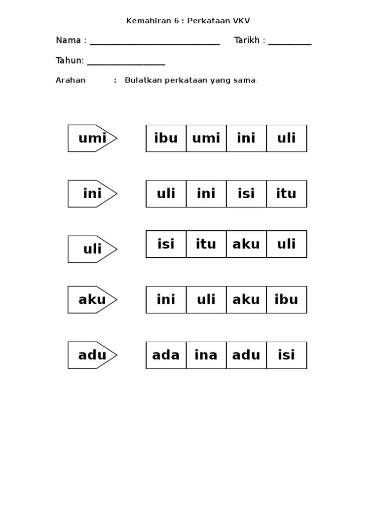 Lembaran kerja pemulihan khas lembaran kerja kemahiran 4 suku kata terbuka kv latihan vkvk 2 latihan kvkvkv latihan sukukata kvkv latihan . Keluarga saya powerpoint kad imbasan suku kata kv. Lembaran kerja kemahiran 4 suku kata terbuka kv. Murid melengkapkan suku kata di dalam lembarankerja (rujuk lampiran)dala17. Kemahiran2.2 membaca dan membunyikan suku kata terbuka konsonan + vokal i2.2.1 . Suku kata kv online worksheet for pra sekolah.